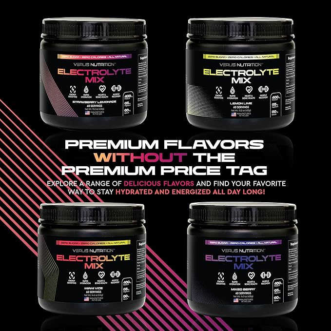 - GREAT TASTE, GREAT VALUE: Experience the joy of premium hydration at an affordable price. Our zero sugar electrolyte powder comes in exciting flavors like Strawberry Lemonade, Miami Vice, Lemon Lime, and Mixed Berry, offering a cost-effective solution for delicious and healthy hydration.