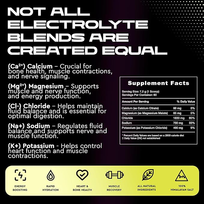 - COMPLETE ELECTROLYTE BLEND: Expertly formulated to reflect the natural balance lost in sweat, our electrolyte drink mix features Calcium, Magnesium, Potassium, Sodium, and Chloride. The precise mix enhances hydration, supports bone health, and optimizes muscle function for peak performance and vitality in every sip.