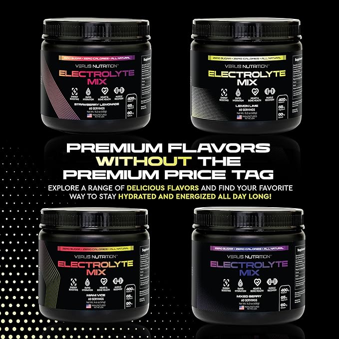 - GREAT TASTE, GREAT VALUE: Experience the joy of premium hydration at an affordable price. Our zero sugar electrolyte powder comes in exciting flavors like Strawberry Lemonade, Miami Vice, Lemon Lime, and Mixed Berry, offering a cost-effective solution for delicious and healthy hydration.
