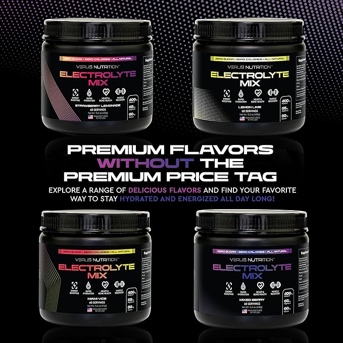 - GREAT TASTE, GREAT VALUE: Experience the joy of premium hydration at an affordable price. Our zero sugar electrolyte powder comes in exciting flavors like Strawberry Lemonade, Miami Vice, Lemon Lime, and Mixed Berry, offering a cost-effective solution for delicious and healthy hydration.