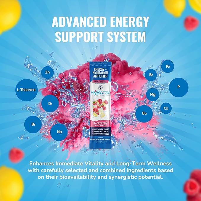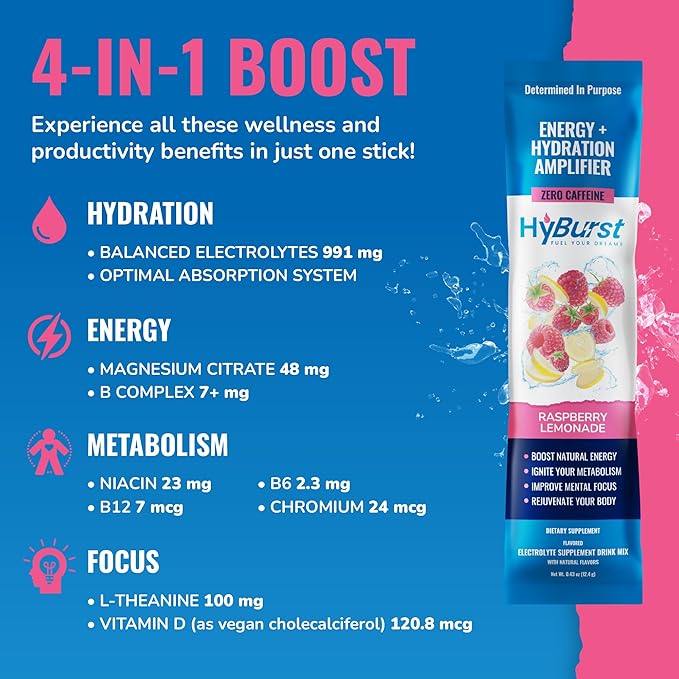 - Natural, Clean Energy Boost - With B12, B6, D3, and L-Theanine, Hyburst offers a caffeine-free energy boost for mental clarity and sustained vitality without jitters or crashes