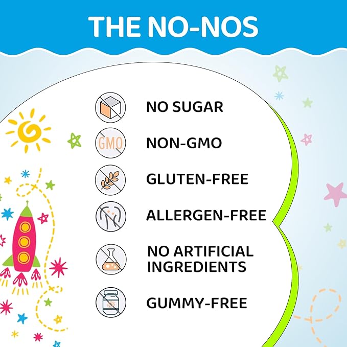 - Enhanced Gut Support*: Our kids' vitamins blend includes a Prebiotic Blend sourced from milk and banana extract, along with vital micronutrients like zinc & magnesium, crucial for bone growth and repair. Together, they promote digestive well-being, aid* enzymatic processes, and uphold gut integrity, ensuring optimal nutrient absorption and vitality.