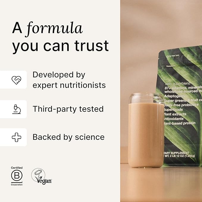 - ULTIMATE SUPERFOOD MEAL: With more than 87 vitamins, minerals and wholefood-sourced nutrients, daily superblend is the perfect breakfast or mid-day energy boost.