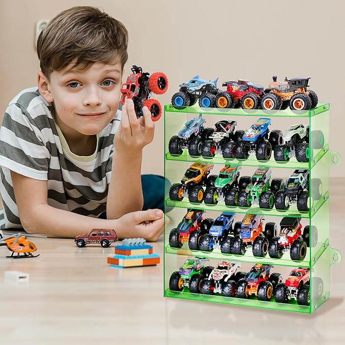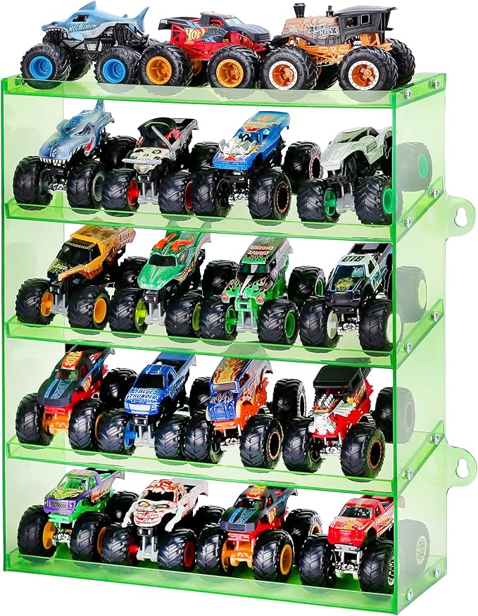 Assembly Monster Trucks Display Case Holding for 20 Monster Trucks Acrylic Storage Case 5 Tiers Monster Trucks Organizer with Tilted Design, Display Case for Toy Trucks (Green)