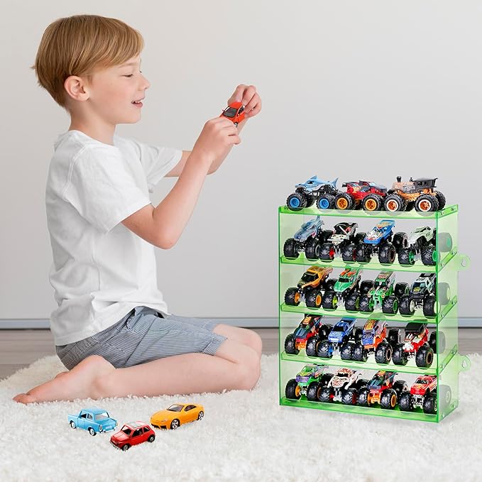 - 5 Levels of Display: This monster truck display case features five levels, each meticulously designed to safely and stylishly display your monster jam trucks. With a capacity of up to 20 trucks, you'll have plenty of room to display your collection.