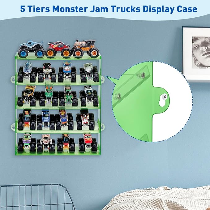 Assembly Monster Trucks Display Case Holding for 20 Monster Trucks Acrylic Storage Case 5 Tiers Monster Trucks Organizer with Tilted Design, Display Case for Toy Trucks (Green)
