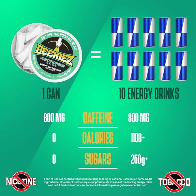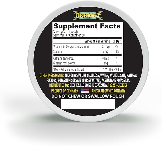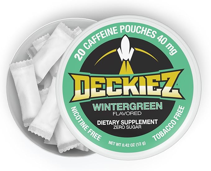 - CONTAINS 40MG OF CAFFEINE PER POUCH: Low on energy? Feeling fatigued? Deckiez Caffeine Pouches contain 40mg of caffeine, nearly 60% more than the leading competitor, and are the perfect alternative to energy drinks, pre workout, coffee, coffee pouches, and other energy supplements.