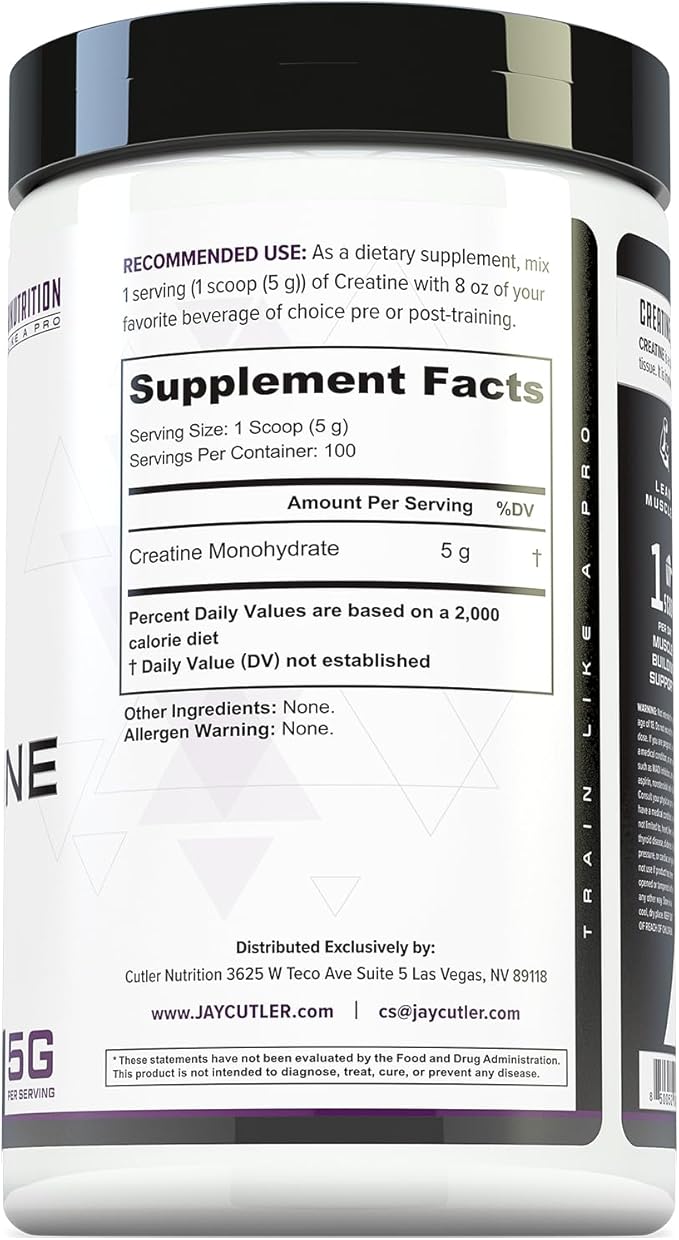- Premium Creatine Monohydrate Formula: Developed by 4-time Mr. Olympia, Jay Cutler, Cutler Nutrition's Creatine Monohydrate delivers 5g of pure, high-quality creatine per serving to support muscle growth, enhance strength, and boost athletic performance.