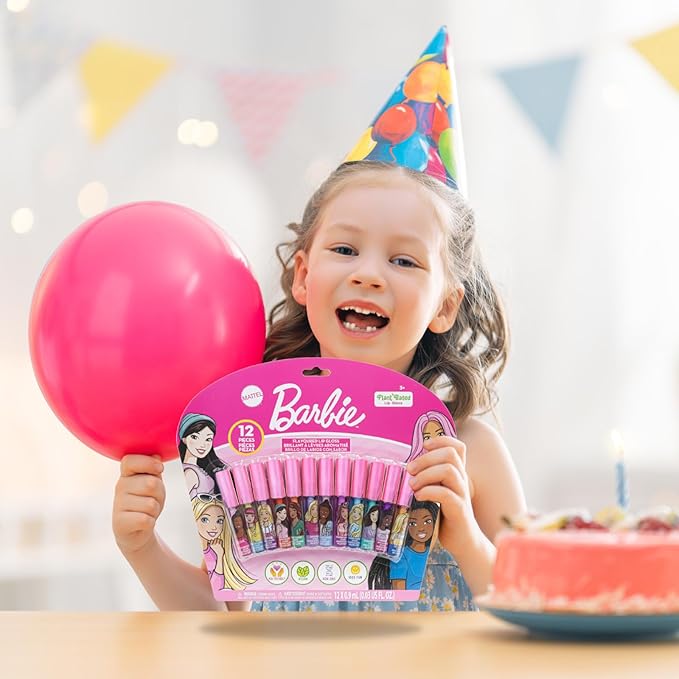 Barbie 12 Piece Plant Based Lip Gloss, Girls Party Favors, First Makeup Set for Girl, Perfect for Parties, Sleepovers, and Birthday Gifts, Ages 3+, by Townley Girl