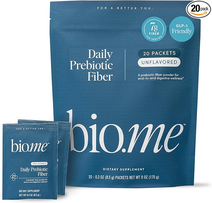 - DIGESTIVE SUPPORT: Take good care of your digestive health with Bio.me Daily Prebiotic Fiber Supplement travel Packs (20 Count). This fiber powder combines two clinically-researched prebiotics, delivering 7g of soluble fiber per serving to support a balanced microbiome without causing bloating, gas, or cramping. This fiber supplement powder is perfect for both men and women and ensures gentle, effective relief.