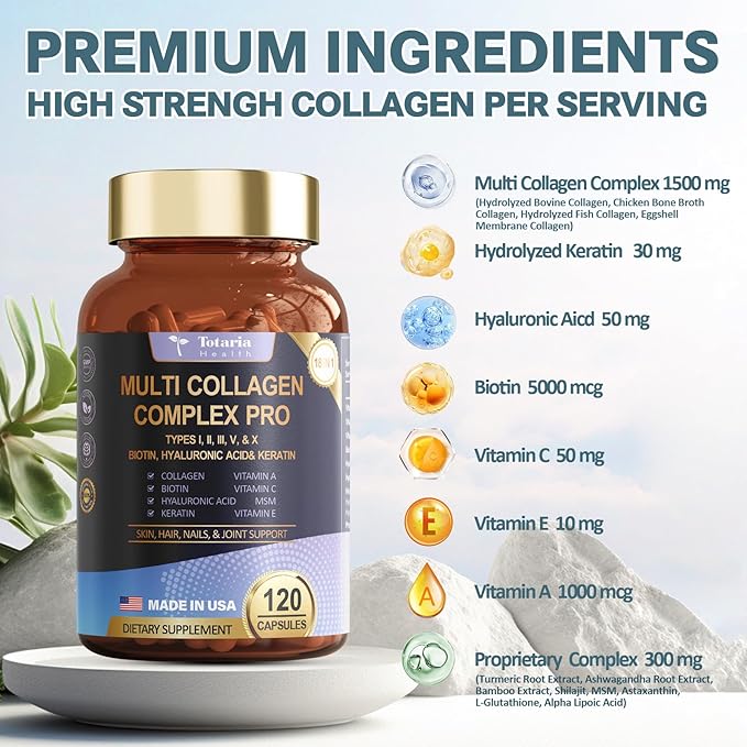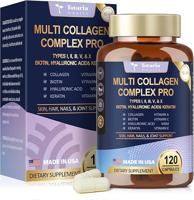 - MULTI COLLAGEN COMPLEX PRO: Hydrolyzed Bovine Collagen, Chicken Bone Broth Collagen, Hydrolyzed Fish Collagen, Eggshell Membrane Collagen cantain multi collagen peptides - Collagen Type I II III V & X . The perfect blend of 18 premium ingredients. Premium collagen supplements for women & men. Totaria glow beauty collagen pills, revealing your skin radiance, youthfulness and vitality easily.