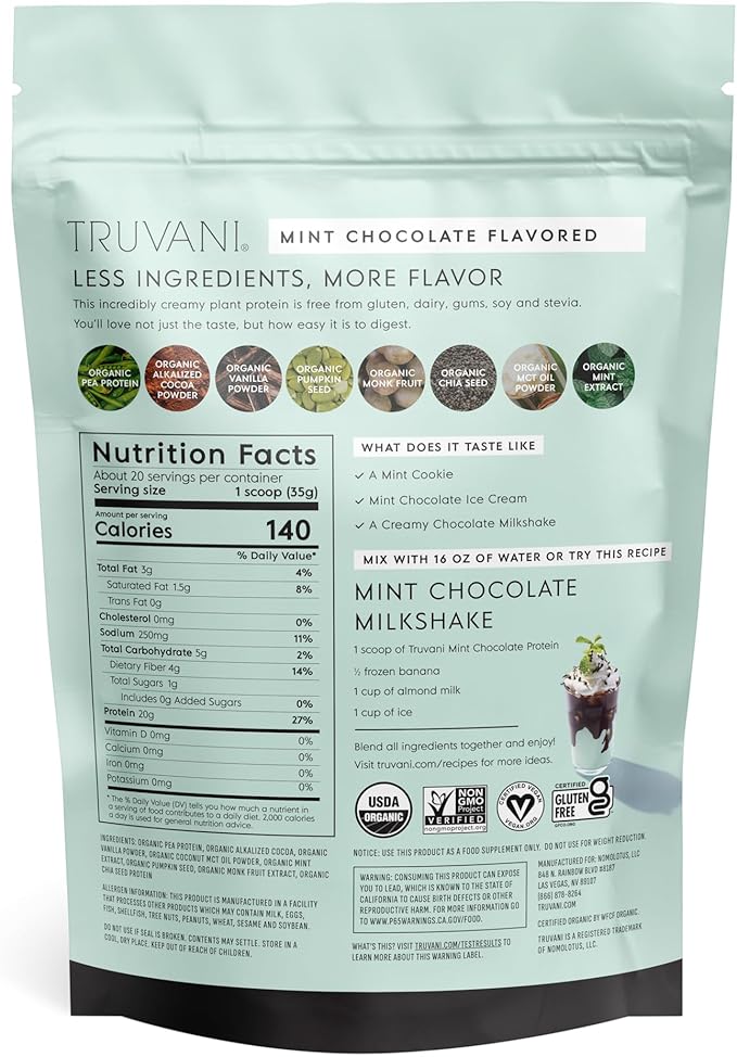 Truvani Vegan Pea Protein Powder | Mint Chocolate | 20g Organic Plant Based Protein | 20 Servings | Keto | Gluten & Dairy Free | Low Carb | No Added Sugar