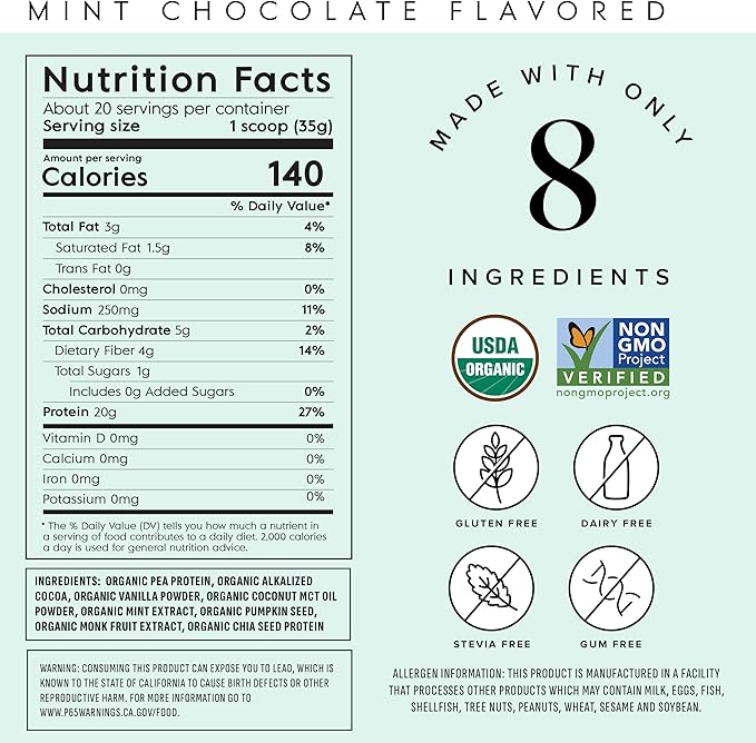 - Certified USDA Organic: Trust in the integrity of our plant-based vegan protein powder, certified USDA Organic, non-GMO, and vegan-friendly. Our straightforward label and simple ingredients ensure transparency and quality. Protein sourced from all organic pea, pumpkin seed, and chia seed.