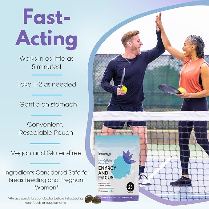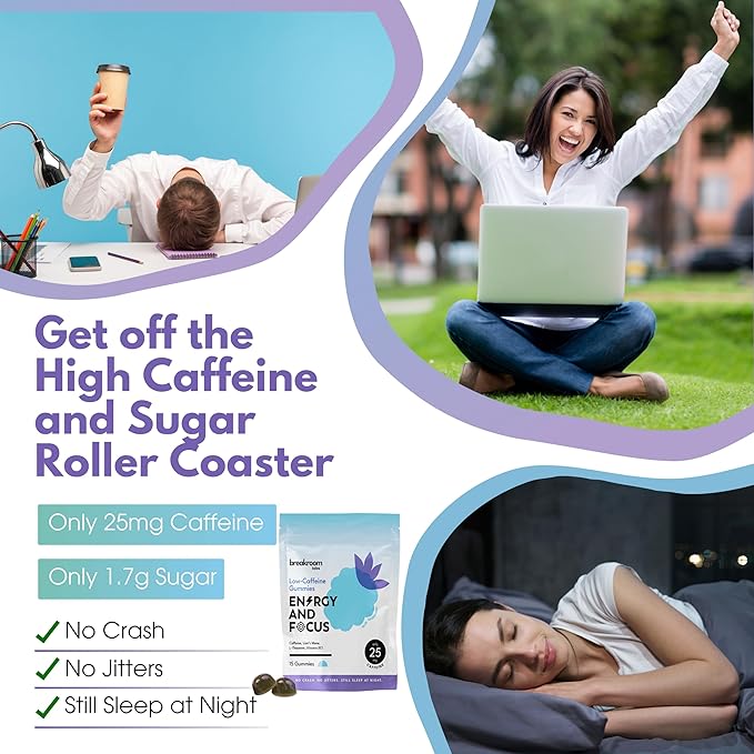 - Elevate your day, the gentle way. Whether you're a busy professional, runner, student or just need an afternoon pick-me-up, our low-caffeine gummies are your go-to solution! Ideal for everything from an after-lunch boost and pre-workout to driving, jetlag, and study. Enjoy a convenient boost anytime, anywhere.