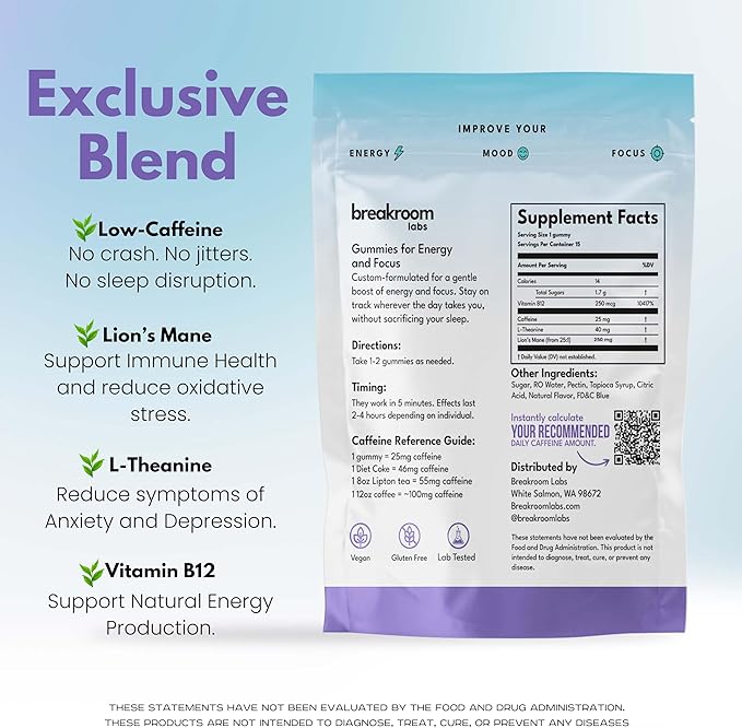 - Smooth Energy- Designed for a gentle, yet effective lift, our low-dose 25mg caffeine gummies are made for everyone yet suitable for caffeine-sensitive, half-caff, and low-caffeine diets. Vitamin B12 naturally supports your body's energy production. Unlike high caffeine gum, caffeine chews, mints, or coffee, our energy gummy is gentle yet fast-acting. No jitters, no crash, or disrupting your sleep.