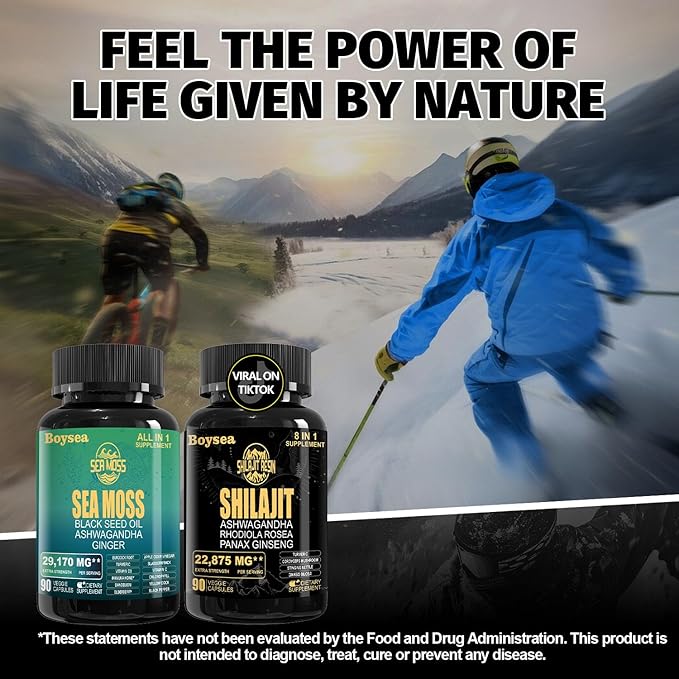 - ★CONVENIENT WELLNESS SOLUTION: Say goodbye to multiple bottles and hello to convenience. Boysea's Shilajit and Sea Moss, Each in his own bottle, provide a comprehensive 8-in-1 and all-in-1 supplement, providing you with an easy-to-carry and consume solution. Enjoy the simplicity of a two-bottle set without compromising efficacy.