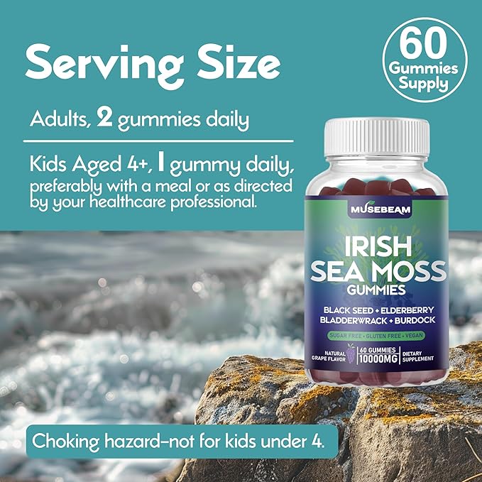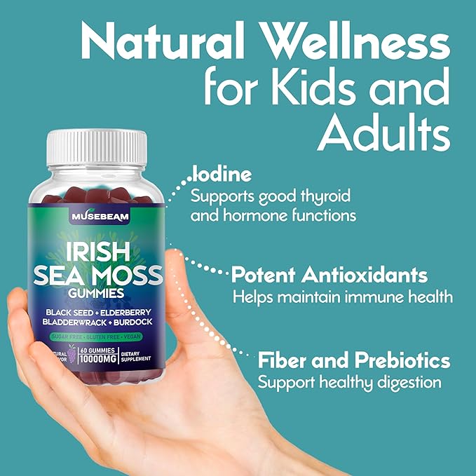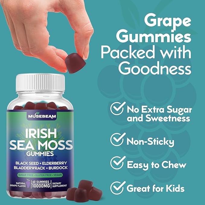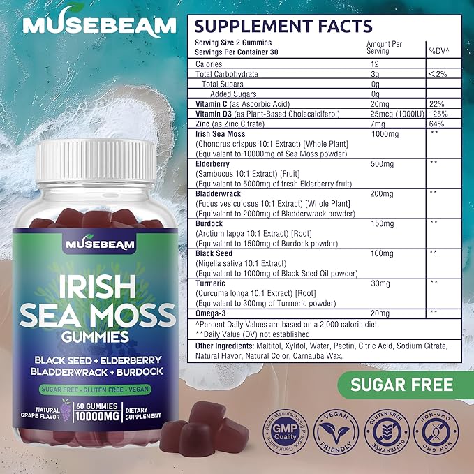 - Powerful Vitamins and Natural Ingredients in Easy-to-Consume Gummies: Our pleasant, nutrient-rich gummies offer a healthy dose of natural Irish Sea Moss, Vitamins C and D3, Zinc, Elderberry, Bladderwrack, Burdock, Black Seed, Turmeric, and Omega-3.