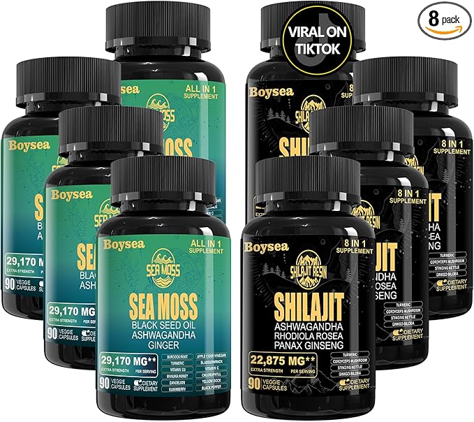 - ★CONVENIENT WELLNESS SOLUTION: Say goodbye to multiple bottles and hello to convenience. Boysea's Shilajit and Sea Moss, Each in his own bottle, provide a comprehensive 8-in-1 and all-in-1 supplement, providing you with an easy-to-carry and consume solution. Enjoy the simplicity of a two-bottle set without compromising efficacy.