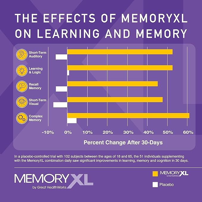 - 5 KEYS TO UNLEASH YOUR POTENTIAL- Consider MemoryXL your personal mental assistant. It can decrease brain fog and is clinically proven to enhance 5 key measures of learning, memory, and cognition. * These include Short-term auditory, Learning and logic, Short-term visual, Recall memory, and Complex memory.