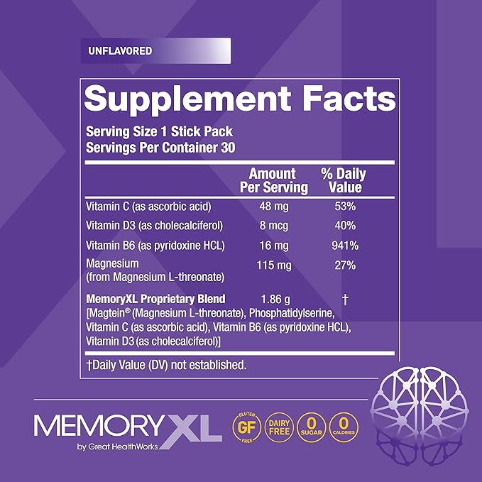 - ONE OF A KIND CLINICALLY PROVEN FORMULA - MemoryXL is the only stick pack supplement combining Magtein, phosphatidylserine, and vitamins C, D and B6. This formula is clinically proven to improve markers of learning, memory, and cognition by up to 50% after only 4 weeks of daily use.*