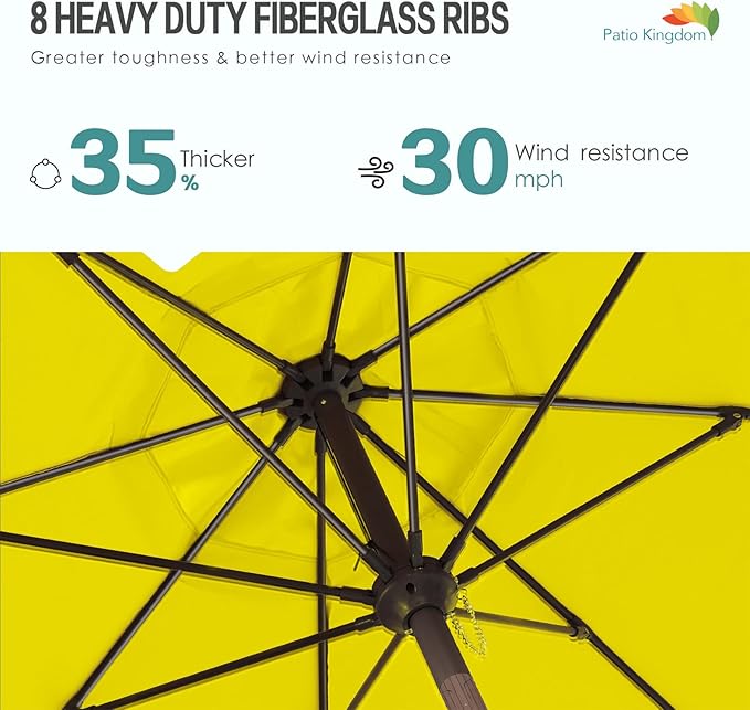 - STURDY FIBERGLASS RIBS: Patio kingdom has designed reinforced fiberglass ribs, that won't rust, lighter than steel for easy and compact storage, makes operation easier. Powder coated iron pole and 8 sturdy fiberglass ribs provides stronger support and are built for stability