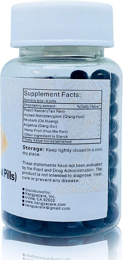 - ★EXPLAINATION OF THE FORMULA: Hemp Fruit is the major ingredient to loosen the bowels and relieve constipation. Peach Kernel and Angelica are auxiliary ingredients to support and nourish blood circulation, moisten and lubricate the bowels. Rhubarb to clear heat; Incised Notopterygium to dispelling pathogenic wind and pathogenic factors. The combination of various herbs is to relax the bowels, promote blood circulation and dispel pathogenic wind.