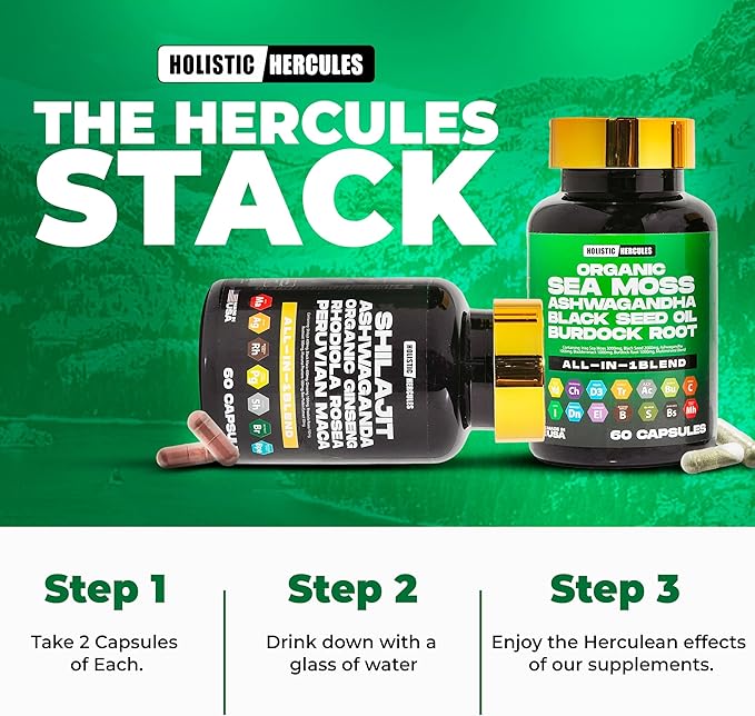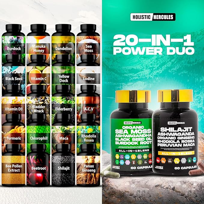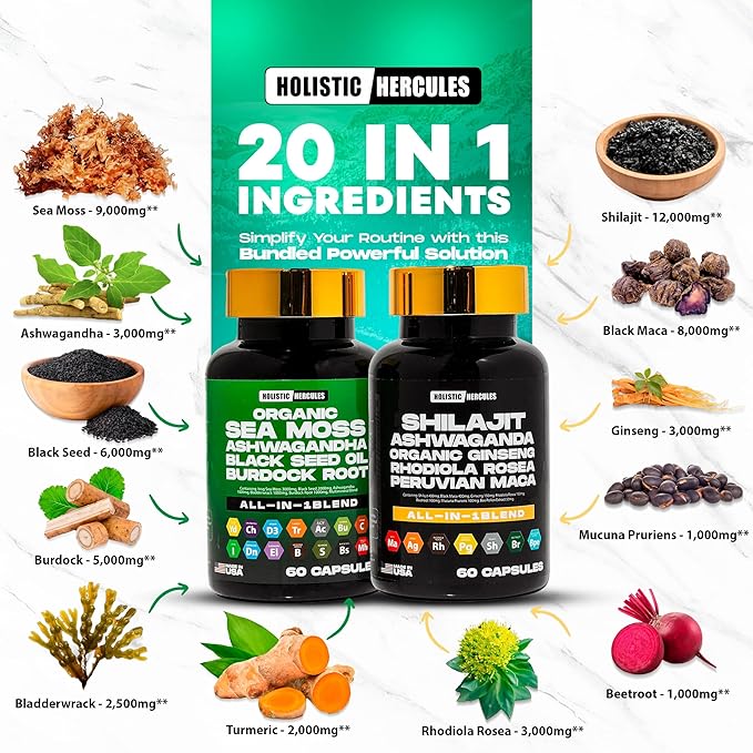 - Holistic Hercules Premium Combo Bundle combines Shilajit and Sea Moss for a comprehensive supplement experience. This potent formula features Shilajit for Men and Women, Shilajit Resin, and Shilajit Capsules, along with Ashwagandha and Black Seed Oil Capsules. Our 20-in-1 blend includes Burdock Root, Bladderwrack, and Turmeric Powder, ensuring a well-rounded approach. Discover the benefits of Sea Moss Capsules, Sea Moss Pills, Sea Moss Advanced, Seamoss Powder, and Sea Moss Gel. This bundle also highlights Sea Moss Black Seed Oil, Ashwagandha Ginger, and Sea Moss Drops, offering a complete solution for your wellness routine.