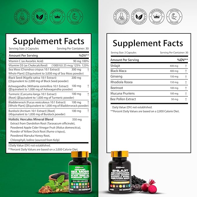 - Holistic Hercules Premium Combo Bundle offers a dual-bottle solution featuring Shilajit and Sea Moss. This blend includes pure Shilajit with Rhodiola Rosea, Ginseng, Black Maca, Beetroot, Mucuna Pruriens, and Bee Pollen Extract. Our MultiMineral Blend contains Sea Moss Pills, Black Seed Oil Pills, Ashwagandha Root, Bladderwrack Capsules, and Burdock Root Capsules, providing various ingredients for your supplement routine. The bundle also features Turmeric Curcumin Capsules, Apple Cider Vinegar, Chlorophyll, and Manuka Honey. Enjoy the convenience of Sea Moss, Bladderwrack, and Burdock Root Capsules as alternatives to gummies, along with raw organic Sea Moss and wildcrafted Sea Moss Gel.