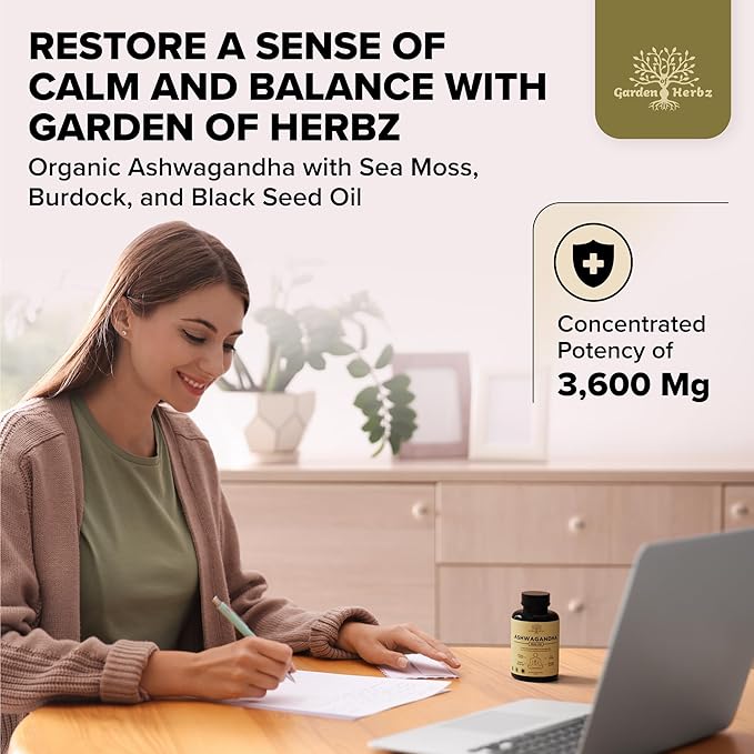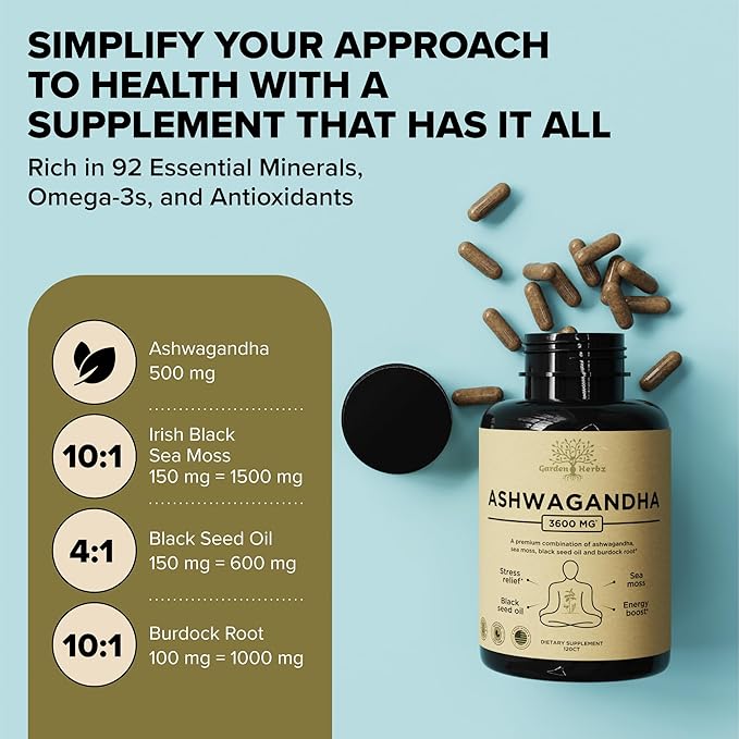 Organic Ashwagandha Root & Irish Sea Moss – 3,600 mg Ashwagandha Supplement with Black Seed Oil, & Burdock Root – Herbal Supplement for Energy, Stress Relief, Extra Strength, 60 Caps