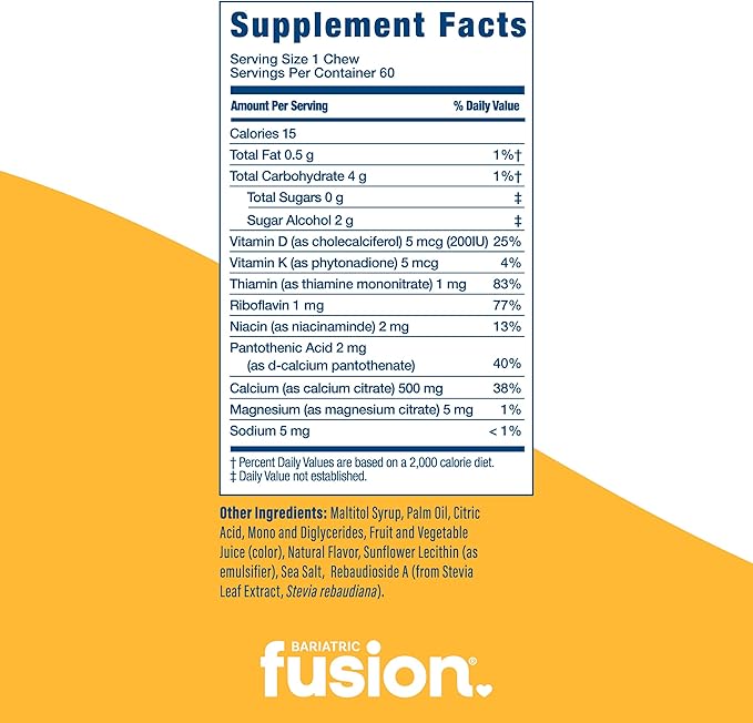 - Premium Bariatric Calcium Citrate Formulation: Each Bariatric Fusion bariatric calcium chew contains 500mg of Calcium Chews with Vitamin D, Vitamin K, and Magnesium; all of which are essential for optimum bone health. Ideal Calcium Chewables for women and men.