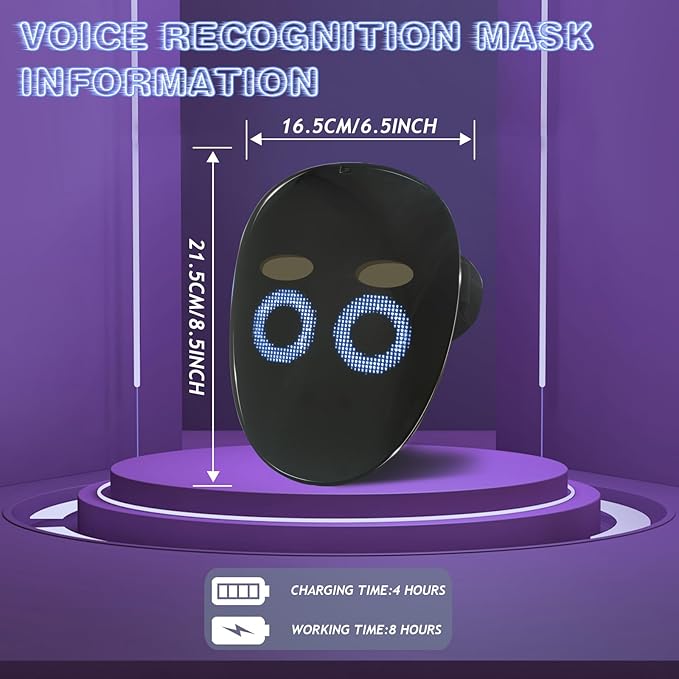 - [Programmable App Controlled, Easy to use]: Our Led Mask with Voice Recognition can be controlled by mobile phone app to improve the convenience. You can easily adjust the modes like brightness, dynamic or static patterns, video playback function, voice recognition, DIY images etc, through the programmable app to adapt to different moods festivals or other occasions.
