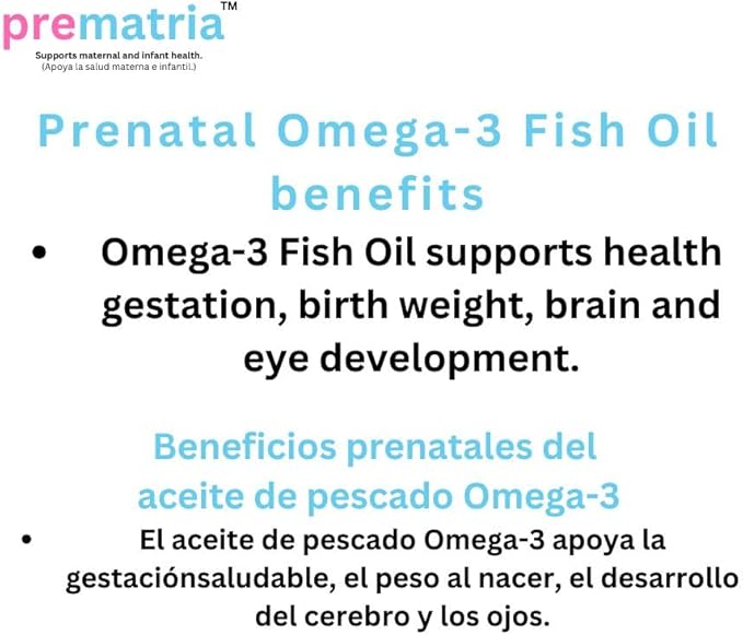 - Special Ingredients : Prenatal Multivitamin. Prenatal folic acid. Prenatal Omega-3 Fish Oil. Prematria Prenatal Multivitamin Folic Acid Omega-3 Fish Oil Softgel contains 100% recommended nutrients with 75% meeting the HHS NIH FDA recommended daily value for Pregnant and Lactating Women. Allergen Free. Egg Free. Peanut Free. Dairy Free. Tree nut Free. Gluten Free. Wheat Free. 120 Softgel Capsules as a dietary supplement, take two 2 softgels per day Prenatal Multivitamin. Prenatal folic acid. Prenatal Omega-3 Fish Oil. Prematria Prenatal Multivitamin Folic Acid Omega-3 Fish Oil Softgel contains 100% recommended nutrients wi… See more