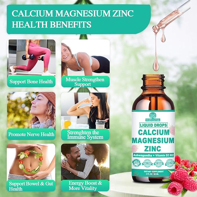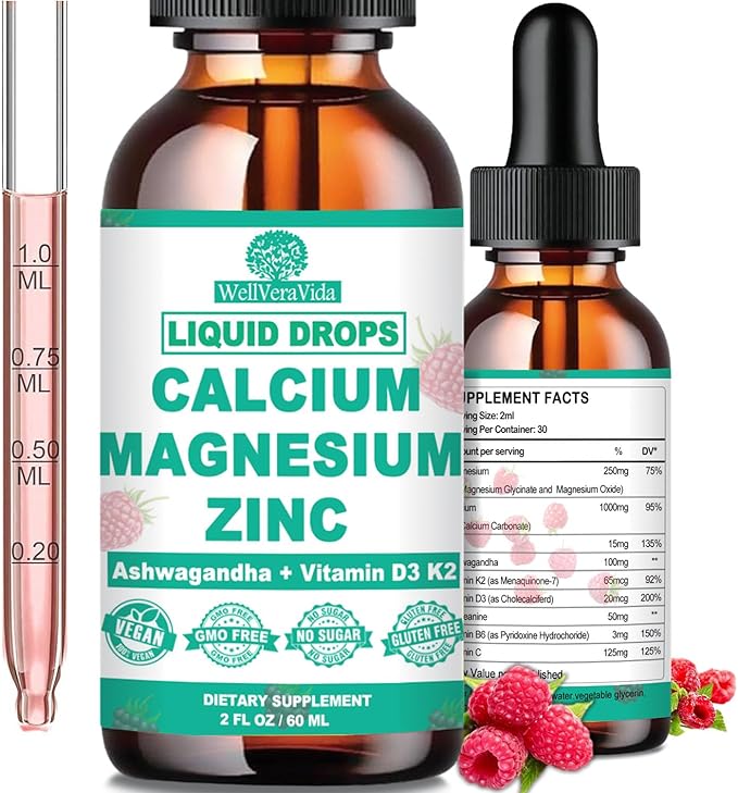 - 💰 CALCIUM MAGNESIUM ZINC D3 SUPPLEMENT: Our Calcio Magnesio y Zinc with Vitamin D3 supplement provides an elite blend of nutrients, including calcium 1000mg, highly bioavailable magnesium glycinate oxide 250mg, and a potent 15 mg of zinc. Our liquid calcium supplement is beneficial for support strong bones and nerve, muscle, and metabolic functions. Plus, WellVeraVida's liquid Calcium Magnesium supplement, fortified with Vitamin D3 K2 B6 and C, is designed for optimal absorption and utilization, maximizing its benefits. This supplement support a strong immune system, a calm, relaxed mood, cardiovascular health, and liver function.