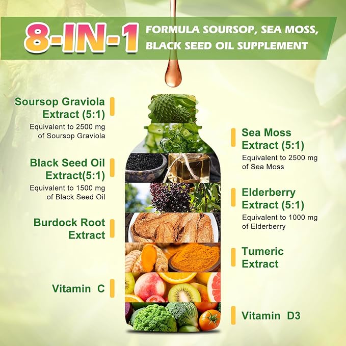 - 【UNIQUE PREMIUM SEA MOSS SOURSOP BITTERS BLEND】B Beworth's soursop bitters liquid supplement formula combines organic sea moss, black seed oil, and soursop graviola leaf & fruit extract, elderberry extract, turmeric, vitamin C, and D3 ingredients. Soursop bitters contain soursop leaves and fruit combined with Irish sea moss and black seed oil formula. It is rich in vitamins and antioxidants, promoting immune system support. Soursop Liquid Drops are vegan-friendly, gluten-free, and made from natural ingredients. Take 2ml daily for enhanced overall well-being.