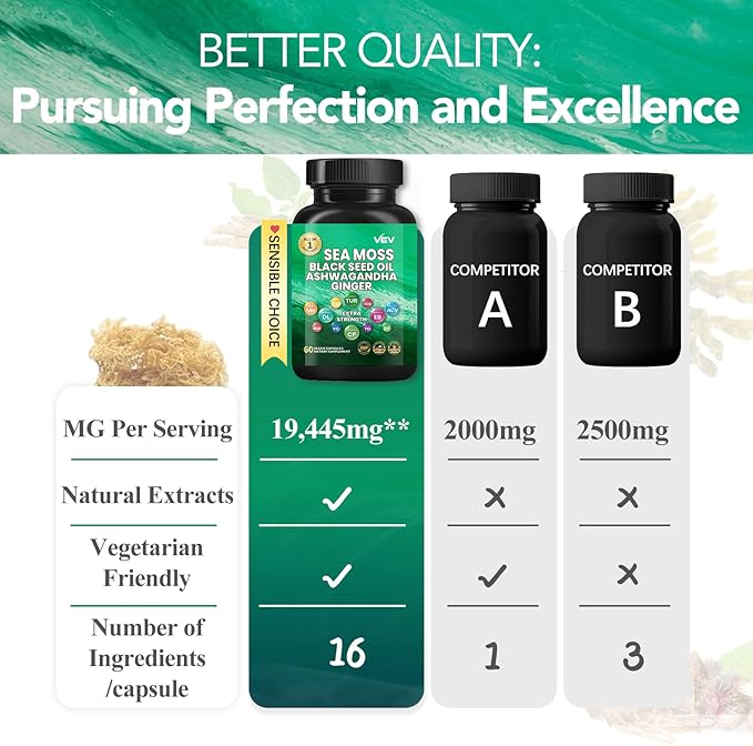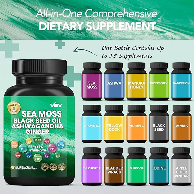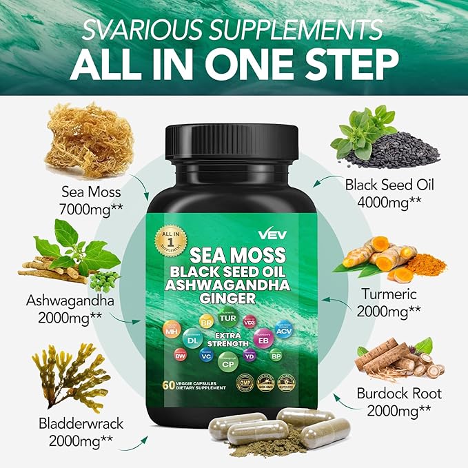 - Comprehensive Multi-Mineral Formula: Our VEV Seamoss Capsules combine Sea Moss, Black Seed Oil, Ashwagandha, Turmeric, and Burdock Root, delivering a 3000mg multi-mineral supplement to meet your daily essential nutrient needs