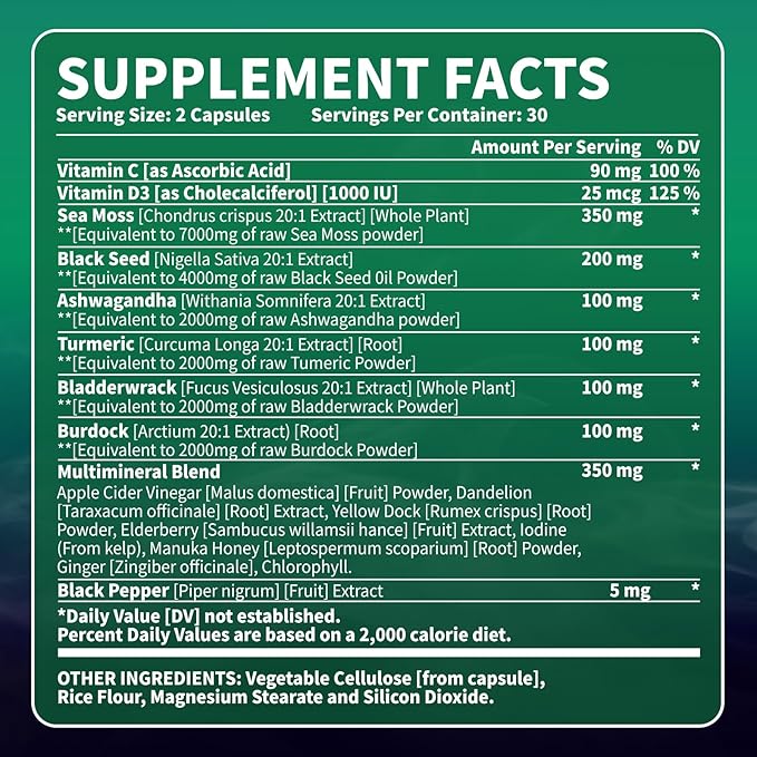 - Convenient All-in-One Solution: These Sea Moss Pills integrate powerful ingredients like Sea Moss, Black Seed Oil, Ashwagandha, and Burdock Root into one product, simplifying your supplement routine with a quick and convenient health support. With multiple effective ingredients, they support your overall health, infusing vitality and energy into your life