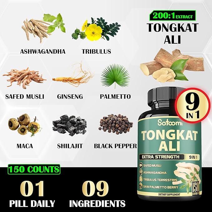 9in1 Tongkat Ali Root Extract 200:1 - Ashwagandha, Tribulus Terrestris - 150 Capsules for 5 Months - Support Strength, Energy & Healthy Immune