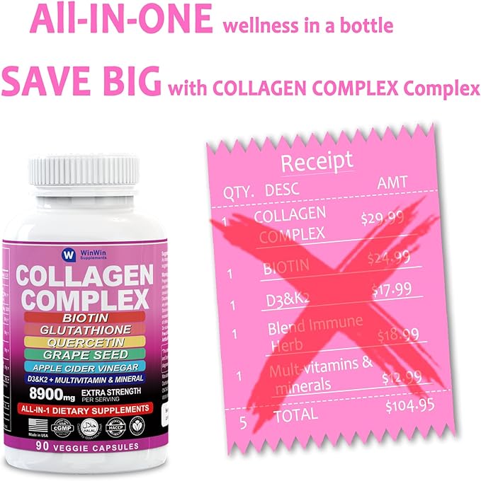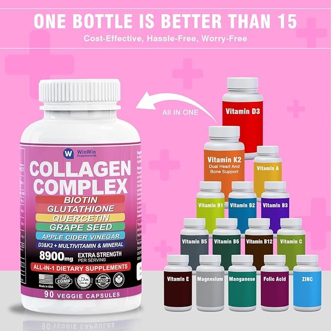 - Collagen complex Supplement: Our Collagen Complex is the ultimate collagen solution. Available in Collagen Types I, II, III, V, and X and 15 Vitamins and Minerals, plus Collagen Complex, Biotin, Glutathione, Quercetin, Grape Seed, Apple cider vinegar and D3K2 blends.