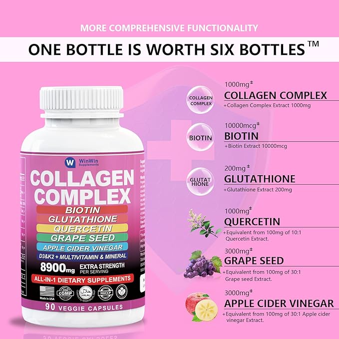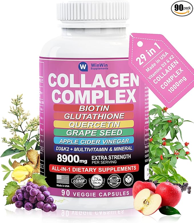 Collagen1000mg Type I, II, III, V, X Multi- Organic Quercetin Grape Seed, Apple Cider Vinegar Botanical Supplement with Biotin Glutathione Multi-Vitamins and Minerals Vitamin 29in1 Made in USA
