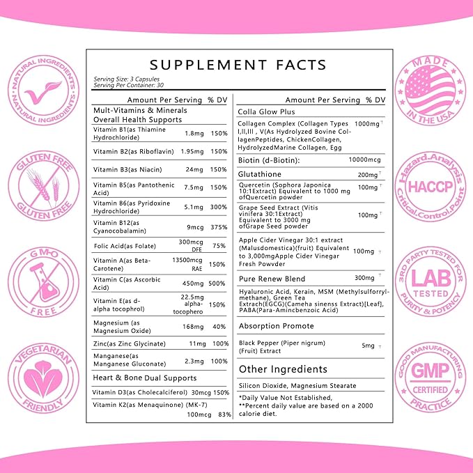 - Each Collagen Pill Formula capsule contains D3&K2 multivitamins and minerals, as well as 29 organic herbal powders and extracts, mainly Collagen Complex Biotin Glutathione Quercetin Grape Seed Apple Cider Vinegar