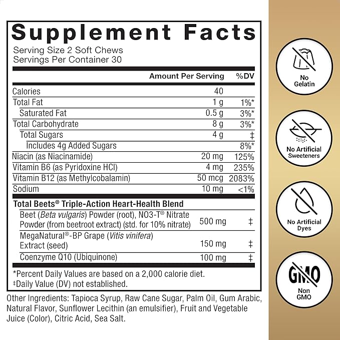 - CONVENIENT & DELICIOUS: Total Beets Heart Health Soft Chews are absolutely delicious and full of sweet and fruity flavor you’ll love. They’re individually wrapped for convenience and easy to chew with no stickiness and no mess