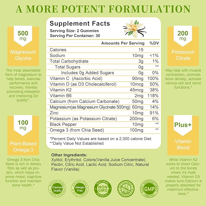 Potassium Magnesium Gummies - High Absorption Magnesium Glycinate 500mg & Potassium Citrate 200mg Plus Omega 3, B6, D3, K2 & Calcium - Chewable Gummy for Leg Cramps, Immunity & Energy - 60 Count
