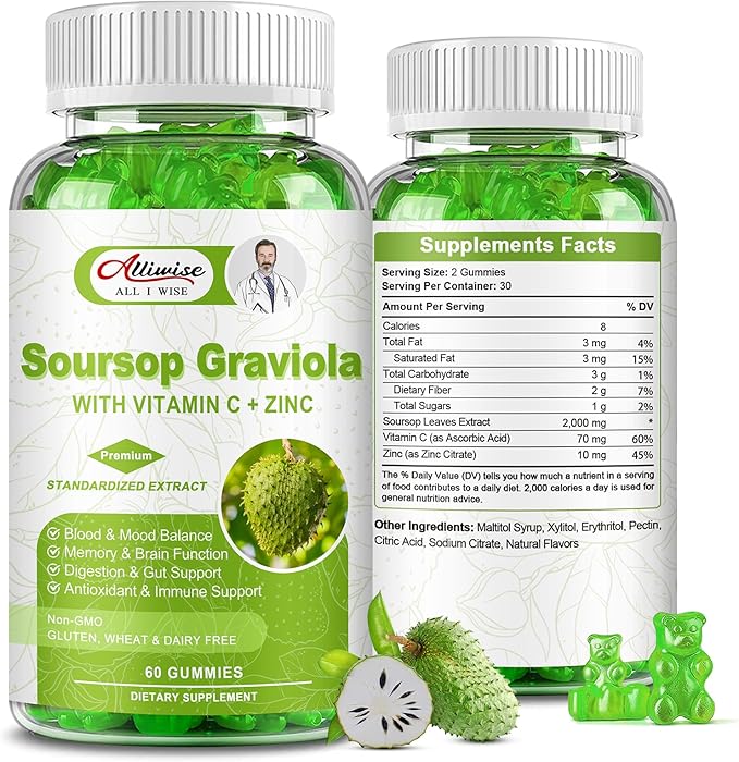 - 2000mg of Soursop Leaves Extract: Graviola is a tropical plant that is rich in nutrients, including vitamin C, B2, B3, B6, and zinc. It also contains plenty of dietary fiber, potassium, and magnesium, all of which can help with intestinal motility. Soursop leaves are commonly used in traditional herbal therapy because they are believed to contain antioxidants and improve overall health. Alliwise soursop gummy supplements can provide comprehensive health support for your body.