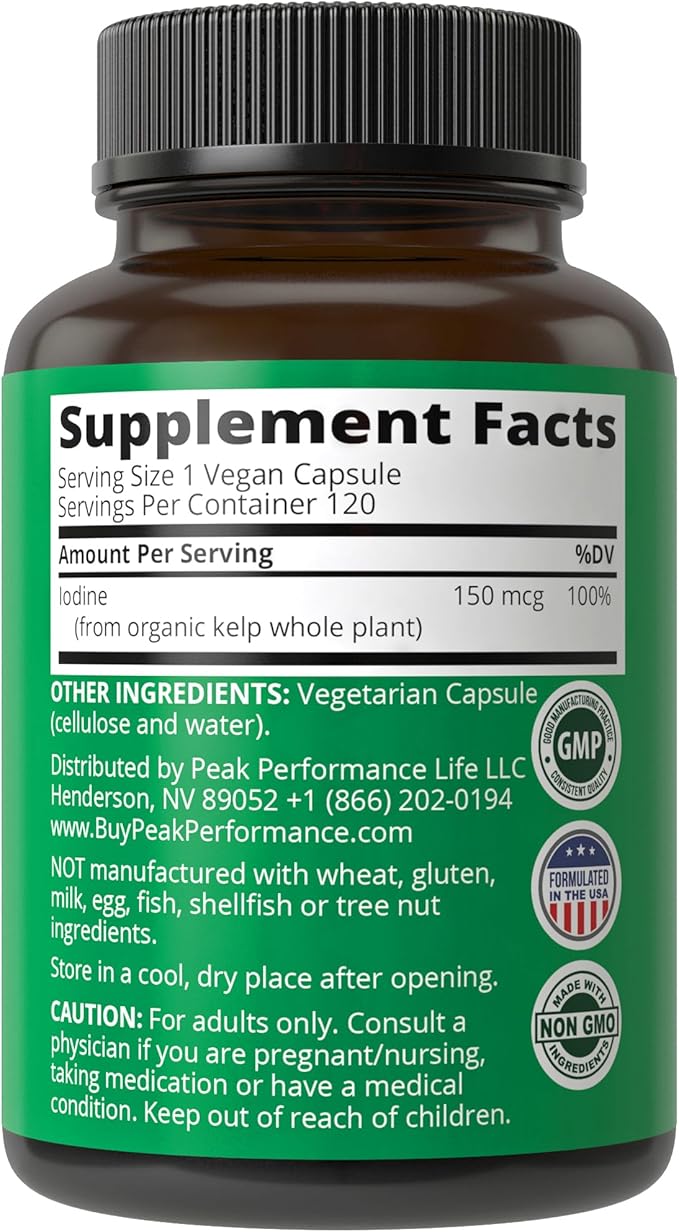 - Most Iodine supplements use weak formulas with synthetic vitamins. Peak Performance offers a potent source of Iodine from Raw Organic Kelp.*