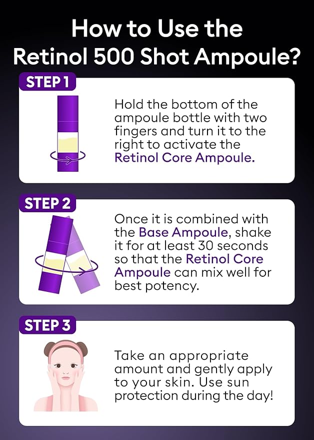 - How to Use: Hold the bottom of the ampoule bottle with two fingers and turn it to the right to activate the Retinol Core Ampoule. Shake for at least 30 seconds to ensure thorough mixing. Apply an appropriate amount to your skin, massaging gently. Use sunscreen during the day for protection.