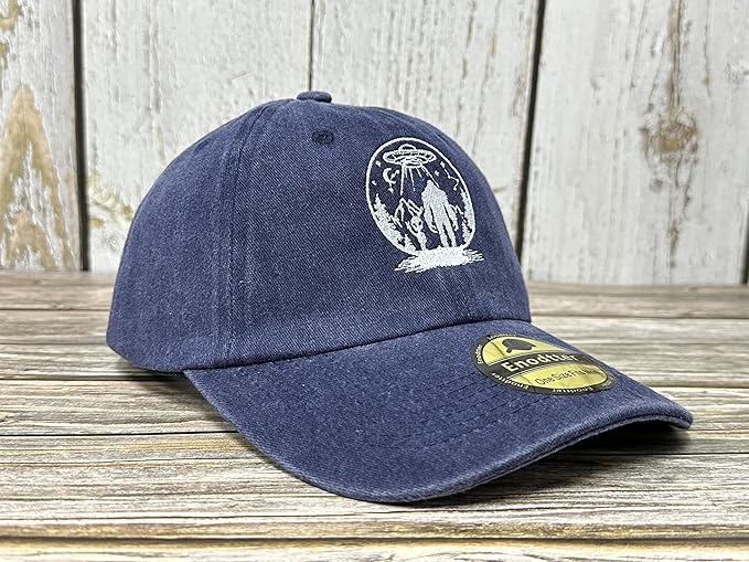- Find Your Style: Bigfoot and Alien Under the Moon washed navy blue dad hat - Perfect gift for a Big Foot believer! Features a Big foot, Sasquatch and Alien under the UFO in the forest at night was embroidered on the front of the soft baseball caps. Great and funny gift for Alien Believers, UFO and Flying saucer Lovers, Sci-fi Lovers, Science Fiction Fans, Spaceship Fans.