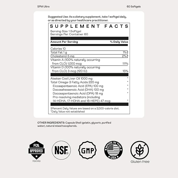 Nuray Pro-Resolving Mediators (SPM's) with Omega 3, Cod Liver Oil for Digestive Health & Immune Support, DHA, EPA, DPA, Gluten- Free, 60 Vegetarian Softgels