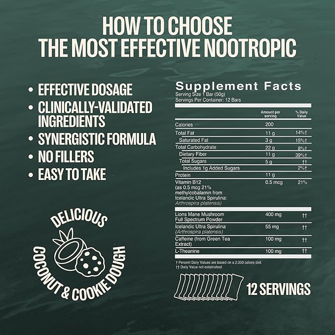 - NOOTROPICS-INFUSED SNACK: Look no further for a boost! Our bars combine Icelandic Ultra Spirulina with clinically tested white-label ingredients like L-Theanine, Lion’s Mane Mushroom, Green Tea Caffeine, and Vitamin B6. Combat fatigue and enhance mental and athletic performance without experiencing a crash later on.