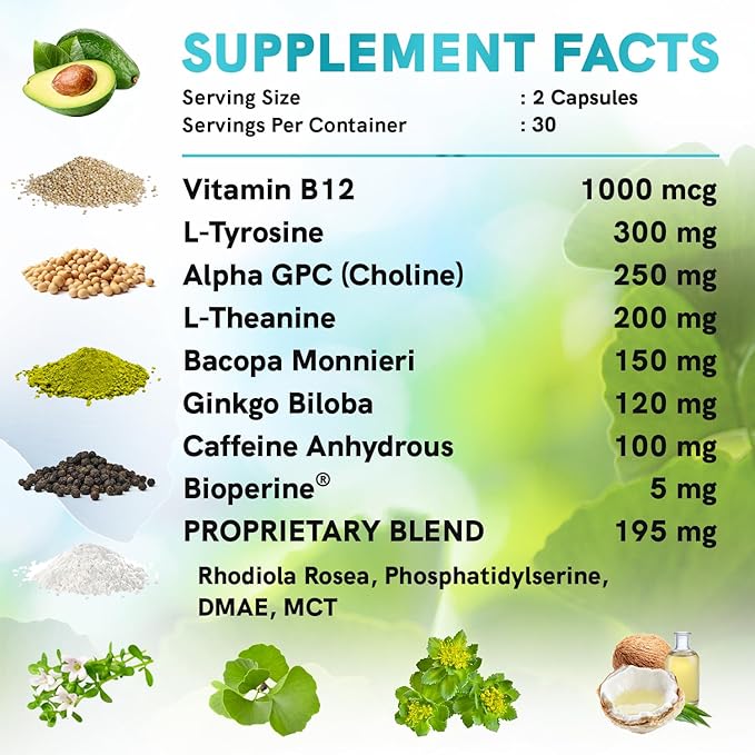 - Powerful Vegan Blend - Enriched with Caffeine Anhydrous, Phosphatidylserine, Rhodiola Rosea, Bacopa Monnieri, & Bioperine for increased absorption, our nootropic brain supplement acts as a memory & focus aid to help you beat brain fog.