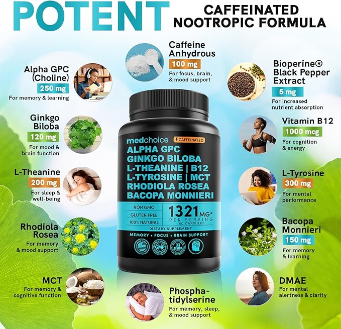 - Caffeine-Infused Memory & Focus Supplement - Keep your brain functioning at its best with our Nootropic Supplement with Caffeine, formulated to help you stay focused amidst life’s daily challenges.